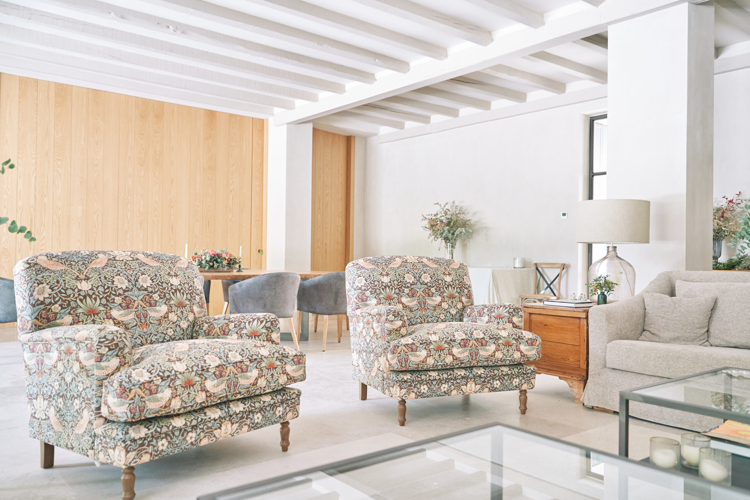 Una zona amplia y versátil, que se conecta con la sala «La Pradera», consiguiendo un espacio más amplio , ideal para ruedas de prensa y cenas empresariales, con un encanto único.