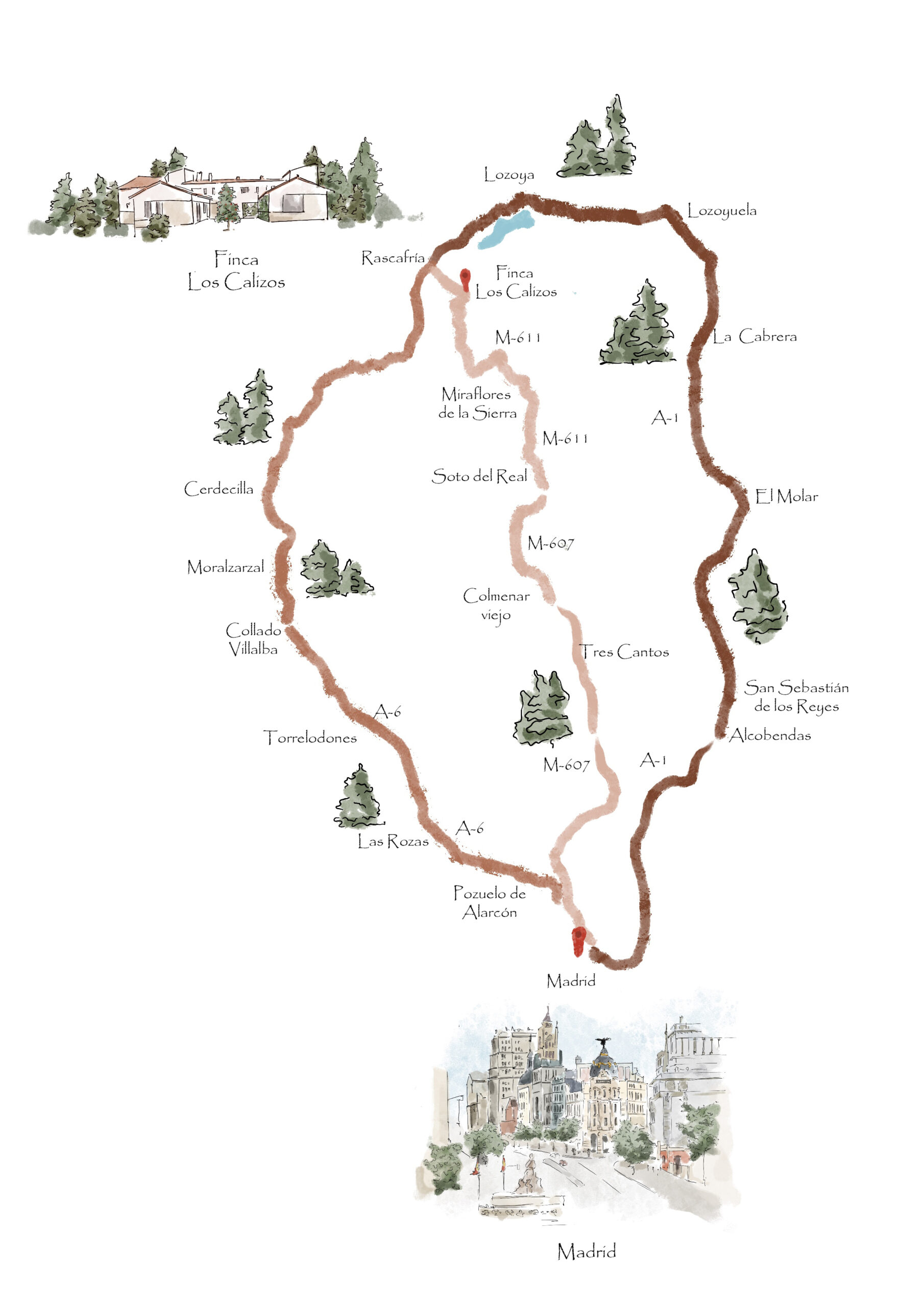 Hay 3 principales rutas para llegar en coche a nuestra finca: la carretera A-1, la carretera M-607, cogiendo posteriormente la M-611 y la A-6. Independientemente de la ruta elegida, a la altura de Rascafría podrás llegar fácilmente a nuestras instalaciones.
